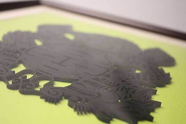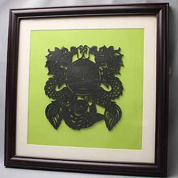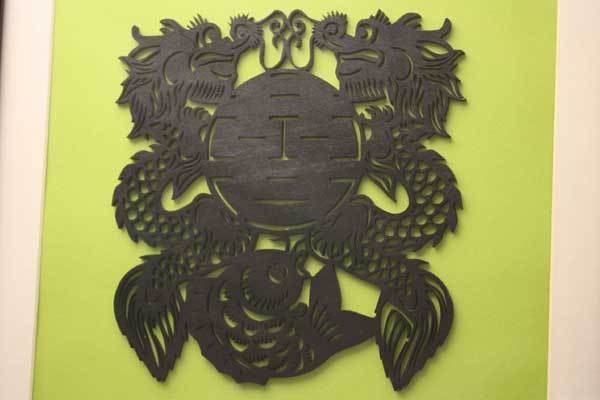 双龍と双喜字という吉祥モチーフの中国伝統切り絵風ウッドカービングを、オリジナル額にしました。