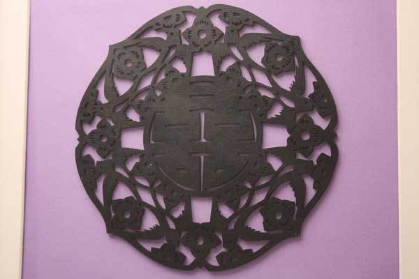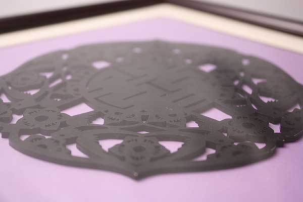 吉祥もチーフとして有名なダブルハピネス(双喜字)の、中国伝統切り絵風ウッドカービングをオリジナル額にしました。