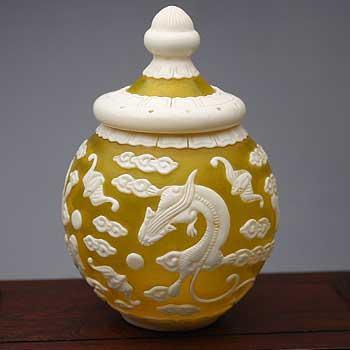蓋付き瑠璃器/黄白藍貔貅(ヒキョウ)