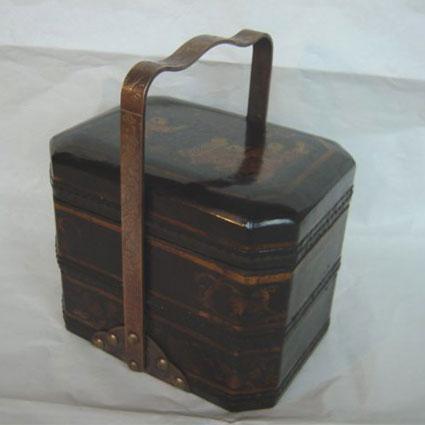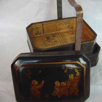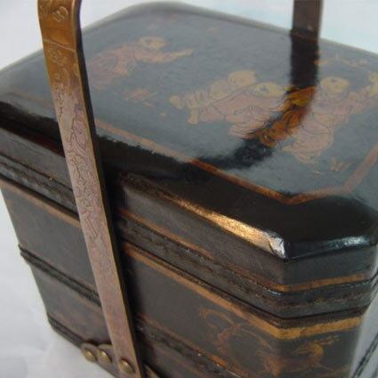 蓋上部には桃と子供の柄、金具部分にはコウモリや竹、雲、龍があしらわれています。