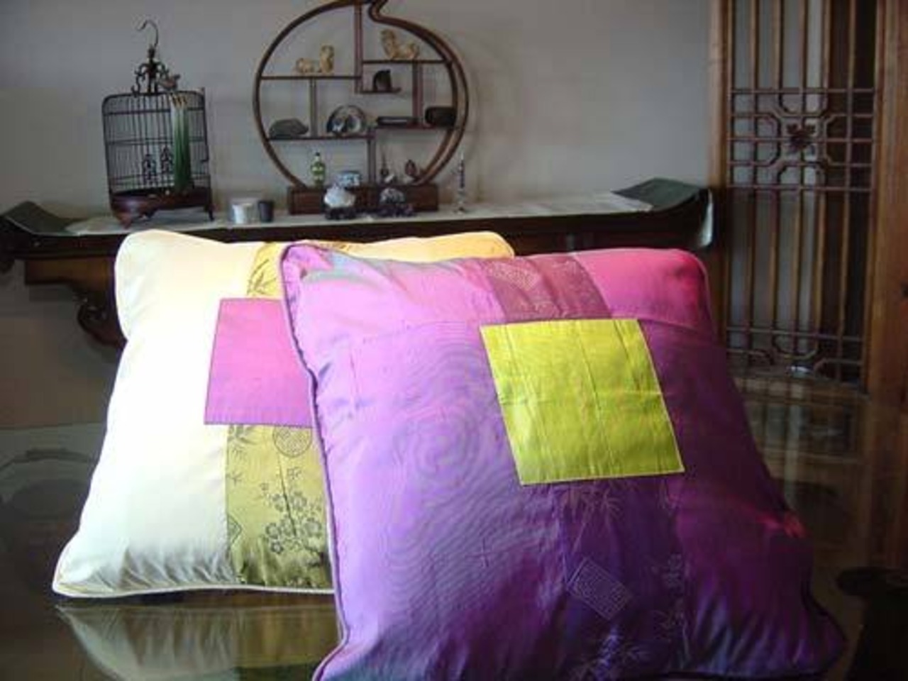張りと光沢のあるシルクを使用。クリームイエローのシルク地の上に、紫色のシルク&万寿、竹、梅のチャイナな吉祥柄布地を組み合わせた、シンプルアジアンなクッションカバーです。