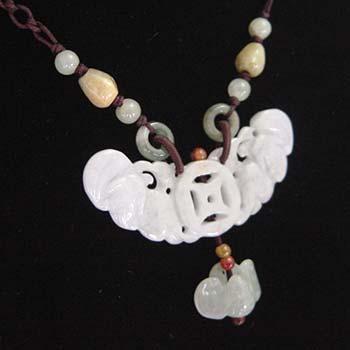 「蝙蝠」は中国語では「変福」の音と同じなため、「福が来る、福に変わる」吉祥柄。対の蝙蝠の間に古銭があしらわれていて「招財」の意味もあるとても運気の上がりそうなネックレスです。しかもぶら下がるように、蝙蝠と古銭がさらについています。