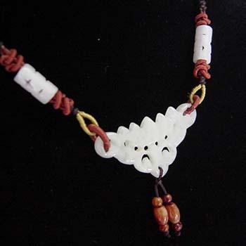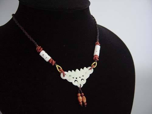翡翠は透明感のある白系。紐は黒、えび茶、ブロンズ。